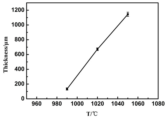 It was found that there were evolutions of bonding between the compacted graphite iron substrate and the nickel-based coating from the as-sprayed one to the annealed. The thickness of the as-sprayed nickel-based coating was about 210 μm. After annealing, the thickness of the translation zone increased from 134 to 672 to 1145 μm as the annealing temperature increased from 990 to 1020 to 1050 °C. The translation zone thickness increased mainly towards the substrate direction at 990 and 1020 °C. When the temperature was increased to 1050 °C, the total thickness of the nickel-based coating and the translation zone was 1306 μm; the translation zone thickness was about 1145 μm. The total thickness minus the translation zone thickness was about 161 μm, which was lower than the as-sprayed thickness of 210 μm. The coating elements diffused to the compacted graphite iron substrate and formed the translation zone, which finally led to the growth of the translation zone towards both the compacted graphite iron substrate and coating. The translation zone thicknesses of three annealed coatings are compared in Figure 5. The thicknesses of the coatings and translation zone are tallied in Table 3. The translation zone thickness increased linearly with the increase of annealing temperature. Furthermore, the formed diffusion transfer zone mainly diffused from the nickel-based alloy coating to the compacted graphite iron.