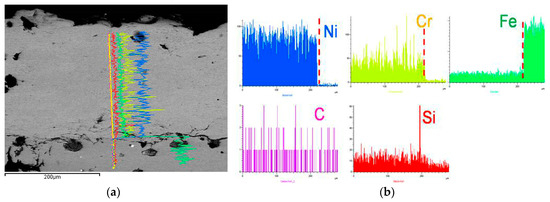 EDS element analysis of the Ni60 coating annealed at 990 °C for twenty minutes: (a) line analysis of elements; (b) element distribution along the line.