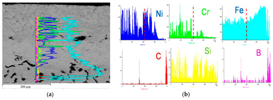 EDS element analysis of the as-sprayed Ni60 coating: (a) line analysis of elements; (b) element distribution along the line.