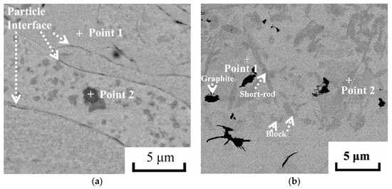 Figure 8 shows the cross-sectional microstructure of the as-sprayed coating and the annealed one at 990 °C for 20 min. There were lamellar structures and many particle interfaces in the as-sprayed coatings as shown in Figure 8a, which reflected the relatively poor cohesion among the as-sprayed coatings. Table 4 shows the element point analysis. The brighter field had higher nickel element contents, as shown at point 1 in Figure 8a. The darker precipitants had higher chromium and iron contents, as shown at point 2 in Figure 8a. After annealing, the particle interfaces disappeared, which improved the inner cohesions of the nickel coatings, as shown in Figure 8b. Short rod, block precipitants appeared. Table 5 shows the element point analysis of the annealed coating at 990 °C for 20 min. As compared to the as-sprayed one, in the brighter phases, nickel and chromium element contents decreased, and the iron element contents increased, which were consistent with the element line analysis results. Meanwhile, in the darker phases, the chromium precipitant content decreased, while the iron element content increased greatly, and some graphite precipitated as free carbon.