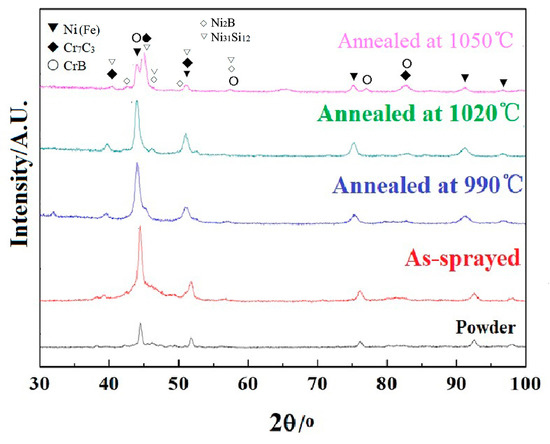 The phase compositions of the as-sprayed coating and re-melted coatings were characterized by XRD, as shown in Figure 9. In the feedstock, there was only a nickel peak, which was very obvious, and the other element peaks were not obvious. In the as-sprayed coating, iron dissolved into nickel, and Ni31Si12 and Ni2B phases precipitated. The results were similar to Wojciech Żórawski’s work [38]. After annealing, Cr7C3 and CrB phase peaks were obvious, which were helpful to strengthen the nickel alloy coating.