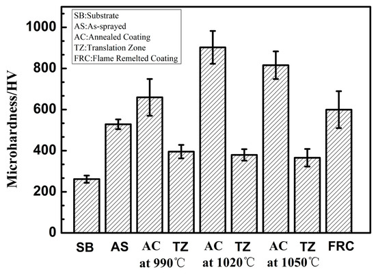 Figure 10 shows the microhardness of different coatings and the compacted graphite cast iron. The microhardness of the annealed coatings increased significantly. The highest hardness of the coating annealed at 1020 °C was 902.4 ± 79.9 HV0.2, which was much higher than the as-sprayed one with the microhardness of 528.4 ± 23.7 HV0.2. In comparison, the microhardness of the annealed coating was obviously higher than the flame re-melted one with the microhardness of 599.4 ± 89.7 HV0.2. Wen et al. [32] reported that the average microhardness of a vacuum re-melted coating was about 875 HV, which was 4% higher than the as-sprayed one. Li et al. [28] reported the coating re-melted by TIG process had an average hardness of 780 HV, which was higher than the as-sprayed one with the microhardness of 580 HV. The translation zone had a comparable microhardness in the three annealed coatings. Moreover, the microhardness of the translation zone was lower than those of the as-sprayed coating and all three annealed ones, while it was higher than that of the compacted graphite iron substrate. All three translation zones had similar microstructures, so they had comparable microhardness values.