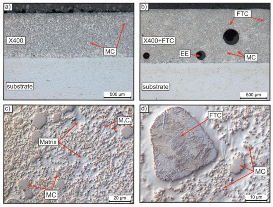Microstructure (optical microscope) of the hardpaint layers X400 (a) and X400 + FTC (b–d).