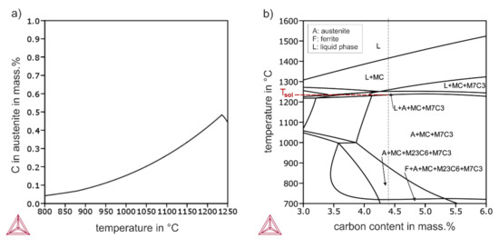 Results of Thermo-Calc calculations for the alloy X400: (a) carbon content in austenite as a function of temperature; (b) phase diagram with marked solidus temperature Tsol.