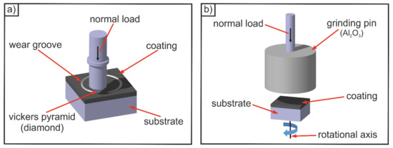 Schematic representation of the scratch test (a) and the abrasion wear test (b), which were carried out to investigate the wear behavior and the wear resistance of the hardpaint coatings.