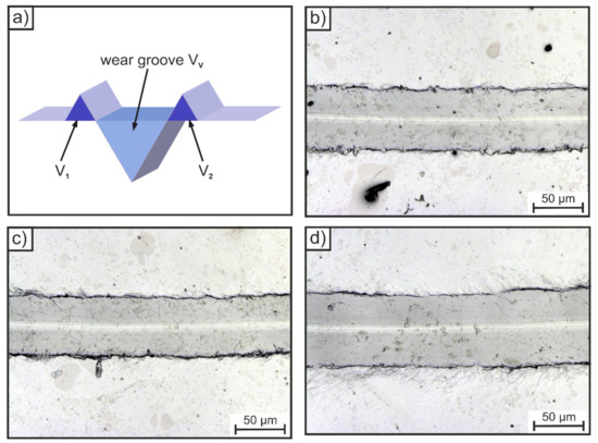 A low fab-value indicates that the process microploughing has predominated. Pure microploughing has a fab = 0, which means that there is no loss of material, whereas a value above 1 indicates that microcracking processes have occurred. The microscopic images agree with the quantitative results, no cracks or breakouts can be identified, Figure 4b–d.