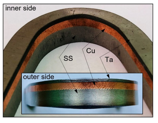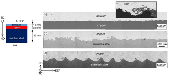 - Parchuri, P.K.; Kotegawa, S.; Yamamoto, H.; Ito, K.; Mori, A.; Hokamoto, K. Benefits of intermediate-layer formation at the interface of Nb/Cu and Ta/Cu explosive clads. Mater. Des. 2019, 166, 107610. [Google Scholar] [CrossRef]