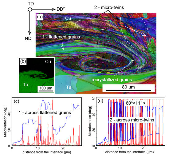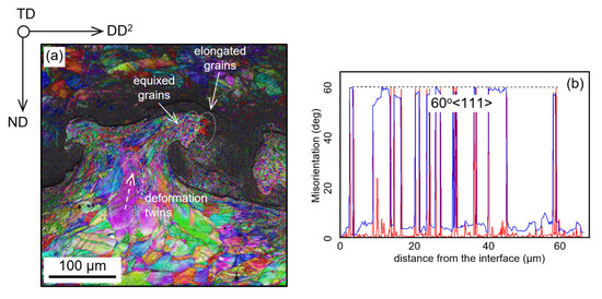 3.2. Microstructure of Severely Deformed Layers of Parent Sheets Near the Interface—SEM/EBSD Analysis
