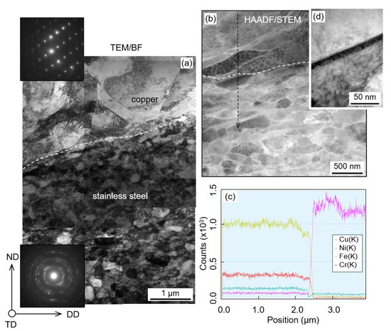 - Paul, H.; Lityńska-Dobrzyńska, L.; Prażmowski, M. Microstructure and phase constitution near the interface of explosively welded aluminium/copper plates. Metall. Mater. Trans. A 2013, 44, 3836–3851. [Google Scholar] [CrossRef]