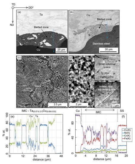 - Paul, H.; Miszczyk, M.M.; Chulist, R.; Prażmowski, M.; Morgiel, J.; Gałka, A.; Faryna, M.; Brisset, F. Microstructure and phase constitution in the bonding zone of explosively welded tantalum and stainless steel sheets. Mat. Des. 2018, 153, 177–189. [Google Scholar] [CrossRef]