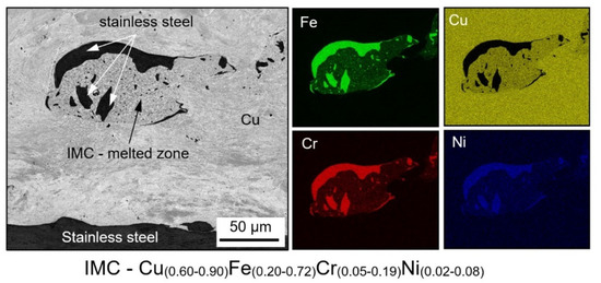3.4.2. Chemical Composition of Solidified Melt Zones Formed near the Stainless Steel and Copper Interface