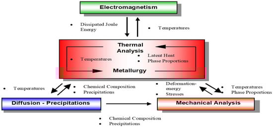 In obtaining results with a very high degree of correlation with real, material data at the software’s disposal is important. Typically, mechanical properties are defined as functions that depend on temperature and the content of individual phases. In addition to the thermo-mechanical data of the material’s, such as thermal conductivity, specific heat/enthalpy, density, Young’s modulus, Poisson’s ratio, yield strength or strengthening, metallurgical properties are also important. The system takes into account phase changes, kinetics for austenitic transformation during heating (TTA diagram) as well as transformations of ferrite, bainite and martensite during cooling (CCT, TTT diagram), Figure 1. The material bases in the SYSWELD package are constantly expanded with new materials and technologies [,,]. The article investigated the influence of thermal cycles that allow obtaining the structure of the heat-affected zone in samples of thermo-mechanically rolled S700MC steel. Tests were carried out for two variants: the use of thermal cycles with a variable maximum temperature value and a constant temperature value of 1250 °C and changing cooling time t8/5 allowed to obtain information about the nature of the changes occurring in the heat-affected zone of the potential welded joint of this steel; this confirmed the thesis that S700MC steel is highly sensitive to thermal cycles.