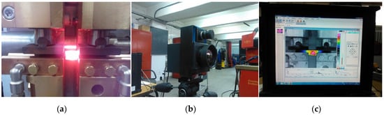 Test stand for simulation and recording of thermal welding cycles: (a) resistance welding machine, (b) thermal imaging camera, (c) computer station screen.