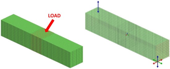 Numerical model with marked area of nodes on which the heat cycle of the heating process (“LOAD”) was given and the boundary conditions of sample clamping.