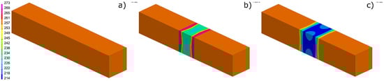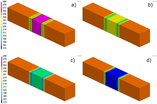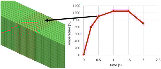 The calculations were based on the “transient” technique, and the thermal cycle forcing was applied on selected model nodes as a function of “Imposed Thermal Cycle” []. This function allows, instead of the welding heat source model usually used in simulations of welding processes, to set any thermal cycle in the form of temperature value in time (Figure 4). This cycle can be set both on individual elements and on their group. When using this technique, it is important to correctly map the heating curve and maximum temperature values as well as such selection of boundary conditions related to cooling to obtain simulation results consistent with real ones. In the described case, it is convenient because it is possible to precisely set the heating speed and maximum temperature of the cycle in accordance with the assumptions adopted in the tests.