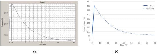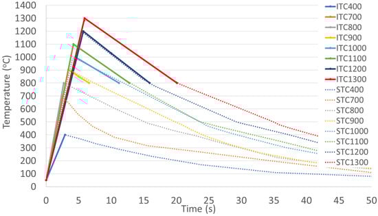 Forcing cycles (ITC) and calculated (STC) inside the heat-affected zone (HAZ) for thermal cycles with the maximum temperature from 400 to 1300 °C (Table 3).