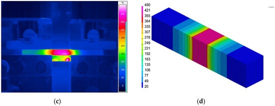 Comparison of (a) the registered and (b) the calculated thermal cycle as well as (c) the thermographic image and (d) the result of the numerical analysis in the form of temperature distribution for the thermal cycle with Tmax = 400 °C.