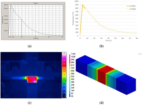 Comparison of (a) the registered and (b) the calculated thermal cycle as well as (c) the thermographic image and (d) the result of the numerical analysis in the form of temperature distribution for the thermal cycle with Tmax = 900 °C.