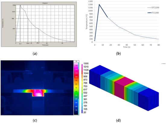 Comparison of (a) the registered and (b) the calculated thermal cycle as well as (c) the thermographic image and (d) the result of the numerical analysis in the form of temperature distribution for the thermal cycle with Tmax = 1200 °C.