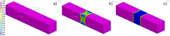 The calculated initial phase distributions (bainite–ferrite) for a thermal cycle with a maximum temperature equal to: (a) 400 °C, (b) 900 °C and (c) 1200 °C (Table 6).