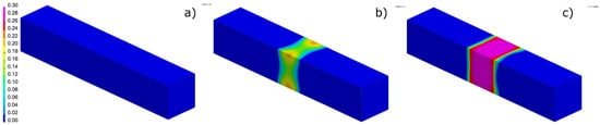The calculated bainite distributions for a thermal cycle with a maximum temperature of: (a) 400 °C, (b) 900 °C, and (c) 1200 °C (Table 6).