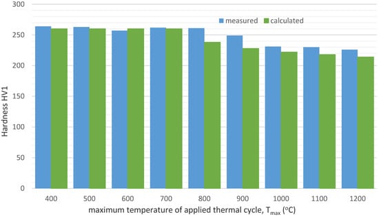 The presented tests and numerical analyses showed that an increase in the maximum temperature of the thermal cycle also causes an increase in the ferrite content and a decrease in the bainite content in the HAZ area (Figure 9, Figure 10 and Figure 11, Table 5 and Table 6). Low heating temperatures (up to approximately 600–700 °C), during which the bainitic structure undergoes the tempering process, do not change the hardness values. The lack of hardness changes along with the increase in tempering temperature is associated with a low concentration of elements’ increasing hardenability, especially carbon.