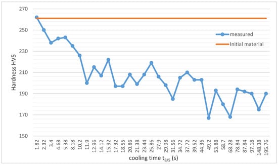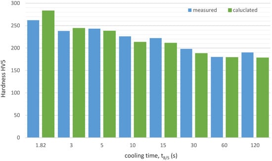 As in the case of numerical analyses of the influence of the maximum temperature of the imposed thermal cycle on the hardness of the HAZ obtained, in the case of analyses with a variable cooling time t8/5, the results obtained were close to the values measured on real samples (Figure 18 and Figure 19).