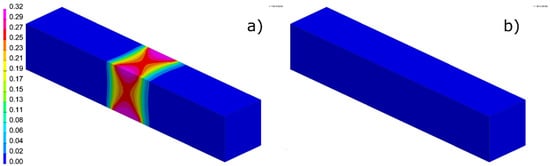 The calculated martensite distributions for: (a) TC0—maximum 31.5% and (b) TC1—0.4%, (others 0%).