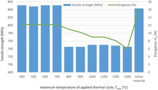 Tensile test and relative elongation of steel S700MC thermo-mechanically simulated HAZ area in of cooling time t8/5, the maximum temperature of thermal cycle was approximately 1250 °C.