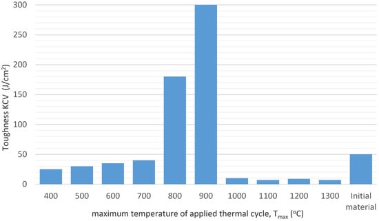 In order to determine the impact of thermal cycle parameters on the mechanical properties of thermo-mechanically simulated HAZ areas, tests were also carried out in the form of a static tensile test and impact test. A static tensile test for round samples, taken from HAZ areas of steel subjected to thermal cycles in the maximum temperature range from 400 to 700 °C, showed a tensile strength value similar to that of the native material. As the maximum temperature of the heating cycle increased, there was a clear decrease in the HAZ tensile strength compared to the parent material—up to 100 MPa. The values of HAZ elongation heated up in the temperature range from 400 to 700 °C were at the level of 12%, with the elongation of native material about 16%. As the HAZ heating temperature increases, the elongation decreases to approx. 6% (Figure 20). Impact tests on obtained HAZ areas carried out at −30 °C showed a significant effect of the maximum temperature of the thermal cycle on the plastic properties of steel. Heat affected zone areas heated from 400 to 700 °C had a lower impact strength compared to the impact strength of the parent material at 20 °C. In the temperature range 800–900 °C, there was a decrease in hardness and a sharp increase in impact strength to the value of approximately 300 J/cm2 (Figure 21).