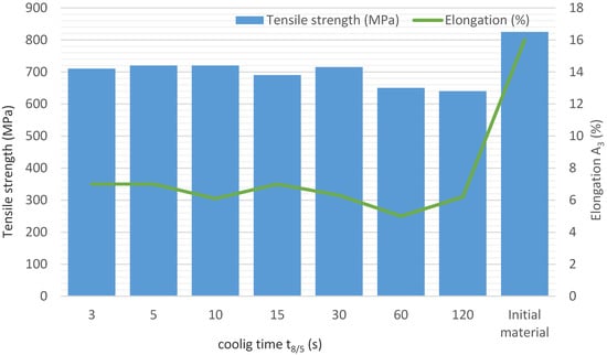 A static tensile test of round samples taken from steel subjected to thermal cycles at 1250 °C, at different cooling times, also showed a small effect of the cooling time t8/5 on the strength properties of the HAZ of S700MC steel. During the entire analysed cooling time range, from 3 to 120 s, the HAZ tensile strength was less than that of the native material. As the cooling time increased from 3 to 120 s, the tensile strength decreased from 720 to 640 MPa. This decrease in strength should be associated primarily with the increase in the ferrite content in the structure and grain growth in the high-temperature, simulated HAZ area (Figure 11, Table 6). The achieved elongation values of 7% are much lower than the elongation of the native material—16% (Figure 22).
