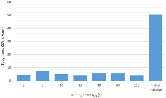 Toughness of S700MC steel thermo-mechanically simulated HAZ area at temperature −30 °C in dependence of cooling time t8/5, the maximum temperature of the thermal cycle was approximately 1250 °C.
