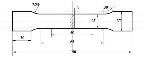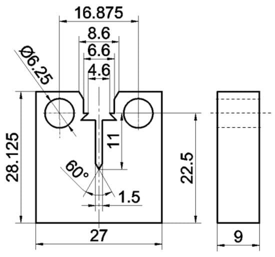 The HESD welding sampling position of the mechanical property test specimen is shown in Figure 7. The tensile and fracture property tests include 11 groups of experiments, nine of which are joint specimens (No. A~I) repaired with different HESD process parameters, while one group consists of joint samples without repair welding and one group consists of base metal. Figure 8 and Figure 9 show the size of the tensile and fracture toughness test specimens, respectively. From Equation (2), KIC is calculated according to JIC, which was in turn measured in an experiment in [].