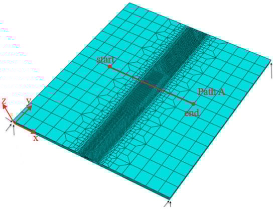 In this paper, the ABAQUS software and its own subroutine DFLUX, FILM (ABAQUS 6.14-5, Dassault SIMULIA company, Providence County, RI, USA) was utilized to simulate the initial welding and HESD repair welding. The simulation used a three-dimensional model. The temperature changes at the weld- and heat-affected zone were large, and the stress state was also complicated. Therefore, the mesh should have been fine in this region. The base material that was farther away from the weld was less affected by the welding, and the mesh could be properly roughened. Therefore, considering the time and accuracy of the calculation, a 2:1 transition mesh was adopted. The size of the model was 250 mm × 200 mm × 10 mm, which contains 89,580 elements and 98,714 nodes. The three-dimensional model is shown in Figure 10.