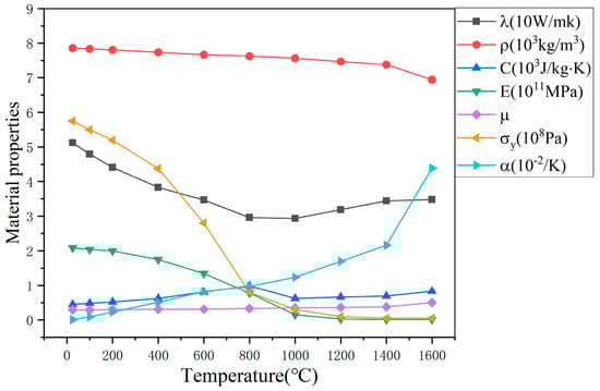 In this simulation, the following assumptions were made: the weld material was the same as the base material (the composition of the electrode material is similar to that of the base metal and matches highly with the base metal), the chemical reaction and phase change during the welding process were ignored and only the fusion latent heat of the material was considered, and the initial temperature was equal to the room temperature. In addition, temperature-dependent thermal-physical material properties were used in the simulation shown as Figure 11. The sequential coupling method was used to calculate the residual stress. First, the welding temperature field was calculated, and the welding temperature field was introduced into the stress field calculation as a predefined field. The process of filling the welding seam was simulated by the method of birth-and-death element. The HESD repair weld bead is the product of several over-lapping spot welds and complex and rapid thermal cycling during welding. This complexity implied that the simulation required a large number of small-time increments and a longer analysis time. In addition, the HESD process simulation needed to set a small initial increment and more iterations.