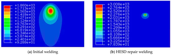 The heat source shape of the initial welding and HESD repair welding is shown in Figure 13. Compared with the initial welding, the heat source of HESD was concentrated, and the center temperature was higher. On the other hand, during the HESD process, the heat transferred uniformly in directions, and the shape of the heat source had no obvious “tail”, tending to be a circle.