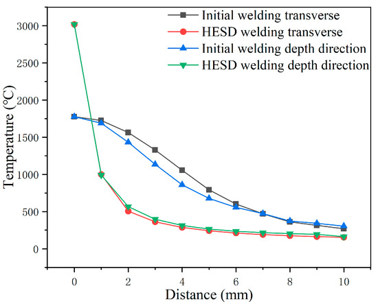 Figure 14 shows the temperature difference in the transverse direction (x direction) and depth direction (z direction) near the heat source during the initial welding and HESD repair welding (starting from the heat source center). The temperature gradient near the initial welding heat source was small, the heat propagated faster along the transverse direction, and the heat influence range was large. The heat source of the HESD repair welding was concentrated, the temperature gradient near the heat source was large, and the heat was evenly spread in two directions. The temperature difference between the depth direction and the transverse direction was not significant, and only the temperature near the heat source was higher.