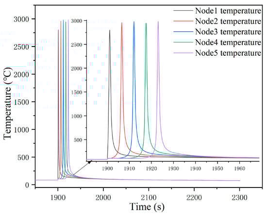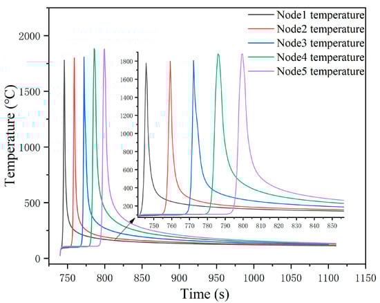 To analyze the difference in the temperature field between HESD and conventional arc welding, five analysis points were taken in the direction of the initial welding seam and repair welding seam. The temperature history curves of the two welding methods were drawn, as shown in Figure 15 and Figure 16. Comparing these two figures, one can clearly see that the high temperature time of analysis point in the initial welding process was longer, and that the cooling process was slower, especially in the middle and low temperature stages. The high temperature time of analysis points in the HESD repair welding was extremely short, and the heating and cooling speed was extremely fast. The whole process from heating to cooling to room temperature could be completed within ten seconds. This is mainly due to the precise control of the heat input and pulse discharge characteristics of the HESD repair welding process. The heating time in a single cycle was much shorter than the cooling time, so the heat had enough time to dissipate and to not accumulate on the workpiece. Figure 16 also shows the extremely fast cooling rate of the HESD repair welding. The characteristics of rapid heating and rapid cooling effectively prevented the growth of austenite grains and the formation of brittle transitions in the welded joint, thereby preventing the performance and the service life of the welded structure from being affected.