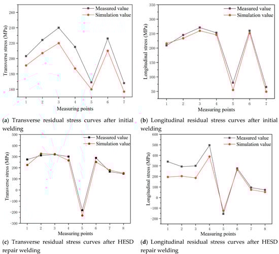 First, in order to verify the correctness of the proposed numerical simulation method, a few test points taken on the surface of the workpiece and the residual stress obtained by the simulation were compared with the value measured via the experiment. Figure 17 shows the comparison between the measured and simulated residual stresses after the initial welding and HESD repair welding, respectively. The results showed that the measured and simulated results were similar in terms of the overall trend and that the data were highly consistent. The method proposed in this paper can accurately simulate the HESD repair welding process.
