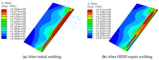 Figure 18 shows the contour of the Von Mises stress field after the initial welding and HESD repair welding. The high stress of the HESD repair welding seam only existed on the surface. This is because the subsequent weld bead heated up or even re-melted the previous weld bead during repair, and the residual stress of the previous welding was released to a certain extent. In addition, due to the heat effect of the HESD repair welding, the Von Mises stress in the initial welding seam decreased by nearly 100 MPa. The high stress after repair was mainly concentrated on the HESD welding seam and the initial welding seam, far away from the repair welding area.