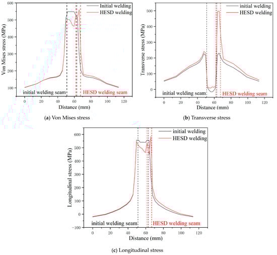 The results in Figure 17 show that the measured residual stress values before and after the HESD repair welding were in good agreement with the simulated values, which indicated the correctness of the numerical simulation method. Therefore, the change of residual stress after the HESD repair welding could be analyzed quantitatively according to the numerical simulation results, and the change curve of the node stress along path A (perpendicular to the direction of the weld) could be drawn. In the Figure 19 the initial welding seam is located between the black dotted lines, and the HESD welding seam is located between the red dotted lines.