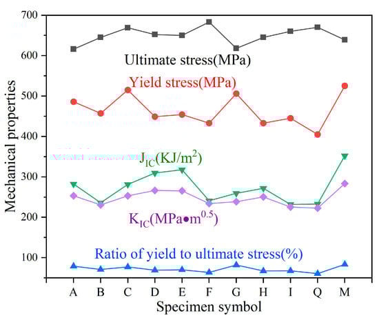 In order to find the optimal HESD repair welding process, the fracture toughness, yield to ultimate strength ratio (), and maximum transverse residual stress value in the repair welding seam were taken as the indexes, while the peak current, voltage, and pulse width of the HESD process were taken as the influencing factors. The orthogonal test analysis of three levels and three factors was carried out. Table 8 shows the orthogonal test schedule. The tensile properties and fracture toughness of nine groups of repair welded joints with different processes were tested, as shown in Figure 20, where Q represents the initial welding joint and M represents the base metal.