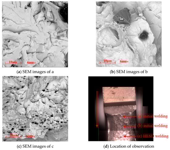 To analyze the reason for the mechanical properties’ change after the repair welding, a metallographic test and fracture scanning electron microscopy were carried out on the joint samples. Figure 21 shows the fracture SEM (scanning electron microscope) images of the compact tensile specimen (No. F) after the test. Figure 21d shows the fracture surface of the compact tensile specimen. The SEM images of the fracture are shown at three positions, from farthest to nearest to the repair weld area along the direction shown in Figure 21d.