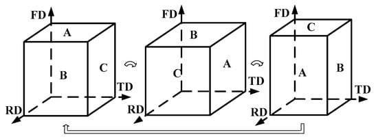 A commercial AZ31 magnesium alloy material was selected in the present study. The chemical composition of which was Mg-3%A1-1%Zn-0.3%Mn. The homogenization for the as-cast billets was conducted at 400 °C for 12 h and followed by water quenching. The rectangular samples were machined from the homogenized ingot with a starting dimension of 40 mm × 35 mm × 35 mm. The samples were heated in a muffle furnace at 300 °C for 5 min before forging. Multiple forging was carried out along three orthogonal directions in turn by an air hammer, and the strain rate was about 100/s. Shown in Figure 1 is the schematic drawing of the multiple direction forging (MDF) process. In the first pass, the initial forging direction was normal to face A, and in the following pass, the forging direction was normal to face B, then the forging direction was normal to face C in the third pass. The true strain was calculated as ln(h0/h1), where h0 and h1 represent the initial height and final height at each forging passes respectively. To investigate the effect of pass strain on microstructure, texture and mechanical properties during HSRMF, 6 passes were employed with 4 different pass strains (Δε = 0.1, 0.16, 0.22 and 0.35). Microstructures analysis was carried out at the central part of the specimens perpendicular to the forging direction (FD) by using electron back-scatter diffraction (EBSD). EBSD observation was conducted on a Zeiss EVO18 SEM equipped (Hengyang, China) with an HKL-EBSD system (Hengyang, China) and operated at 20 kV, and the step size for measurement was 1.5 μm. The Schultz reflection method by X-ray diffraction was used to characterize the texture. The dog-bone shaped tensile specimens were machined form the alloys forged to 6 passes, and the gauge length was 10 mm. The specimen was tested under constant speed of 0.5 mm/min with the tensile direction paralleling to RD at room temperature.
