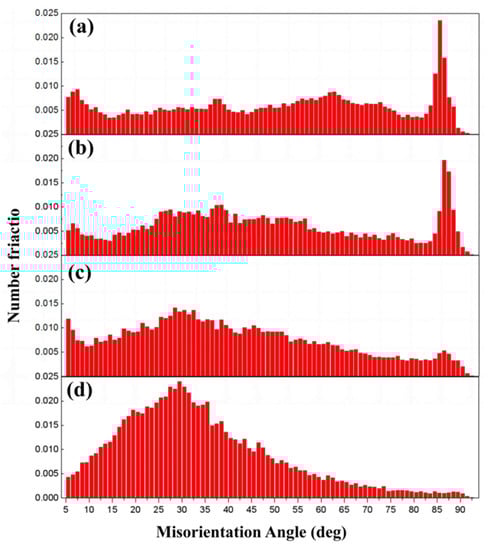 In order to analyze the boundary evolution of the grain and twin during HSRMF, misorientation angle distributions at different accumulated strains with a pass strain of Δε = 0.22 were characterized by EBSD, as shown in Figure 2. It is observed from the EBSD results that the boundary with low angles (<5°) were significantly affected by the polishing state compared to the boundaries with higher angles, therefore, the boundaries with misorientation angles higher than 5° were taken into consideration in the present study. As shown in Figure 2a, four peaks were found in the misorientation distribution map around 8°, 38°, 64° and 86° as the accumulated strain of ∑Δε = 0.22, and the maximum peak of the boundary misorientation was located around 86°. As the accumulated strain increased to ∑Δε = 0.44, three peaks were observed around 8°, 38° and 86°, and the number fraction increased around 38° while it decreased around 86° compared to the previous forging pass (Figure 2b). With the increasing strain, the maximum peak shifted from 86° to the other location, and the peaks around 38° were much weaker (Figure 2c). The boundary misorientation became randomly distributed at an accumulated strain of ∑Δε = 1.32, and most of the peaks that occurred at lower accumulated strains disappeared (Figure 2d).