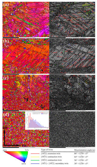 According to the description above, it was confirmed that the local peaks around 38°, 64° and 86° could be ascribed to the {101(-)1}-{101(-)2} secondary twin, {101(-)3} contraction twin and {101(-)2} extension twin, respectively. The peaks around 38° and 86° were detected in all of the alloys before full recrystallized, therefore {101(-)2} and {101(-)1}-{101(-)2} twining are the predominant twinning at the early forging pass of HSRBF. Zhu et al. [] and Li et al. [] have reported similar results about high strain rate deformation of magnesium alloys. Moreover, a certain number of DRX grains were found within the twinned regions and at grain boundaries. Owing to the high density of deformation twins forming at high strain rates, we could infer that DRX within twins was dominant during HSRBF. It is acknowledged that twinning induced DRX (TDRX) is the DRX mechanism within twins, and twin boundaries can impede the dislocation motion and provide the driving force for DRX, as a result, the grains in magnesium alloys are significantly refined [,]. Therefore, the formation of high density twins and subsequently TDRX were the main reasons for the grain refinement of AZ31 alloy in the present study.