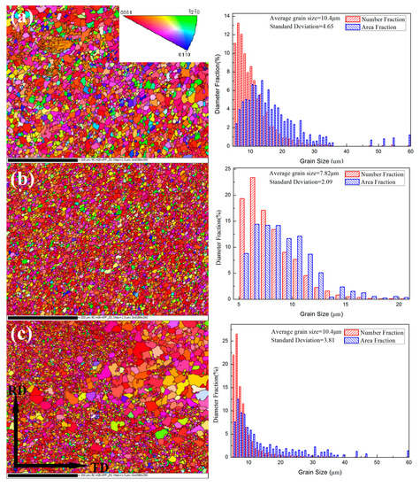 Shown in Figure 4 is the inverse pole figure maps and grain size distributions of alloys HSRMFed to 6 pass with different pass strains. An incomplete DRXed structure with inhomogeneous DRX grains was observed in the alloy HSRMFed to 6 pass with pass strain of Δε = 0.1. The average grain size was 10.4 μm with a standard deviation of 4.65 μm. The frequency of the small DRX grains (< 10 μm) was about 22% while the frequency of the large DRX grains (> 15 μm) was about 48%, and some unDRXed regions were detected. The structure of the alloy HSRMFed to 6 pass with a pass strain of Δε = 0.16 was similar to the alloy HSRMFed to 6 pass with a pass strain of Δε = 0.22. A full recrystallized structure with an average grain size of 7.82 μm was detected as shown in Figure 4b, and the corresponding standard deviation was 2.09 μm. The frequency of the small DRX grains (< 10 μm) was about 53% while the frequency of the large DRX grains (> 15 μm) was about 7%. Inhomogeneous DXR grains were detected in the full recrystallized alloy HSRMFed to 6 pass with a pass strain of Δε = 0.33 as can be seen in Figure 4c, and about 45% of the grains were finer than 10 μm while some of the grains grew to 30–60 μm. The average grain size was 10.4 μm with a standard deviation of 3.81 μm. As mentioned above, the microstructure of the alloys HSRMFed to 6 passes with different pass strains were quite different, i.e., homogeneous structures were obtained at a medium pass strain (Δε = 0.16–0.22) while inhomogeneous structures were formed at a lower (Δε = 0.1) or higher (Δε = 0.35) pass strain.