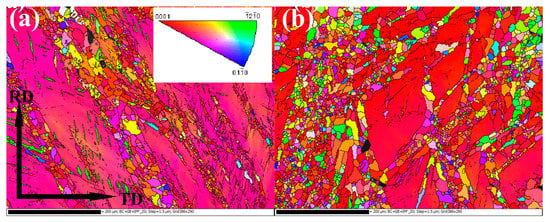 EBSD results of AZ31 alloys HSRMFed to different accumulated strain with a pass strain of Δε = 0.35, (a) 1.4 and (b) 1.75.