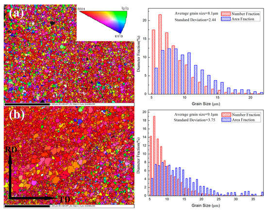 To analyze the effect of pass strain on the microstructure during HSRMF, the alloys HSRMFed with pass strains of Δε = 0.1 and 0.35 were tested by EBSD. As can be seen in Figure 5, both twins and DRX grains were observed in the alloys HSRMFed with pass strains of Δε = 0.1. However, both the twin lamellae and DRX grain sizes of the alloy HSRMFed with pass strains of Δε = 0.1 were much coarser than those of the alloy HSRMFed with higher pass strains. In other words, the grain refinement of HSRMF with a lower pass strain (Δε = 0.1) was less extensively compared to larger pass strains (Δε = 0.16–0.22). As can be seen in Figure 6a, a homogeneous DXR structure with an average grain size of 8.1 μm was obtained in the alloy HSRMFed to the accumulated strain of ∑Δε = 1.4 with a pass strain of Δε = 0.35, and the related standard deviation was 2.44 μm. The grain size distribution was similar to that of the alloys HSRMFed to 6 pass with a medium pass strain (Δε = 0.16–0.22), and the frequency of the small DRX grains (<10 μm) was about 54% while the frequency of the large DRX grains (>15 μm) was about 10%. With an increase of the accumulated strain in the alloys HSRMFed with a higher pass strain (Δε = 0.35), an abnormal grain growth developed as shown in Figure 6b, and most of the grains were finer than 20 μm while some of the grains grew to more than 30 μm. The average grain size was 9.1 μm with a standard deviation of 3.75 μm.