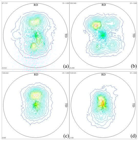 The (0002) pole figures of the AZ31 alloy HSRMFed to 6 pass with different pass strains are shown in Figure 7. As can be seen in Figure 7a, a double peak texture characteristic of axisymmetric pole figures was detected in the alloy HSRMFed with a pass strain of Δε = 0.1, and the intensity maximum rotated to RD away from the center of the pole figure. The texture intensity increased as the pass strain, and pole figure became unsymmetric with intensity maximum rotated to the rolling direction (RD). Typical rolling texture with a circle-shaped distribution of {0002} orientation was obtained in the alloy HSRMFed with a pass strain of Δε = 0.22 and 0.35 as illustrated in Figure 7c,d. However the basal poles split about 30° and 20° from the center of the pole figure in the alloy HSRMFed with a pass strain of Δε = 0.22 and 0.35 respectively, implying that the inclination of the basal pole from forging direction (FD) decreased as the pass strain increased. Due to the limited slip systems in hexagonal crystal (HCP) structure, strong texture always exists in the wrought magnesium alloy after plastic deformation. Many efforts have been done on texture weakening, both titled texture [] and double peak texture [] were reported to weaken textures and results in better formability. It was worthy to note that titled texture or double peak texture could be achieved in the AZ31 alloy HSRMFed with a pass strain ranging from 0.1 to 0.35.